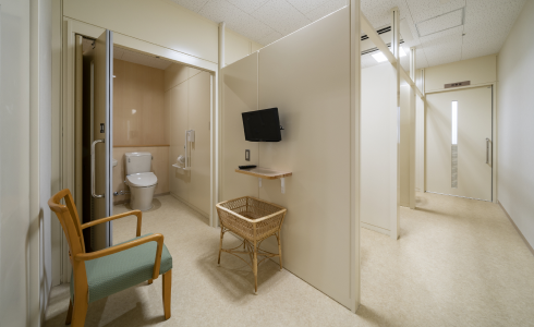 大腸内視鏡検査のためには2L近い腸管洗浄液の内服をしていただき、何度もトイレに通って頂いて便が完全にきれいにならなければ検査が出来ません。そこで少しでもリラックスして前処置を受けて頂けるようにお一人様ごとに専用のテレビと個室トイレをご用意いたしました。